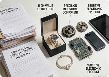 Confidential legal/business documents, high-value luxury goods, precision industrial parts, sensitive electronics.
